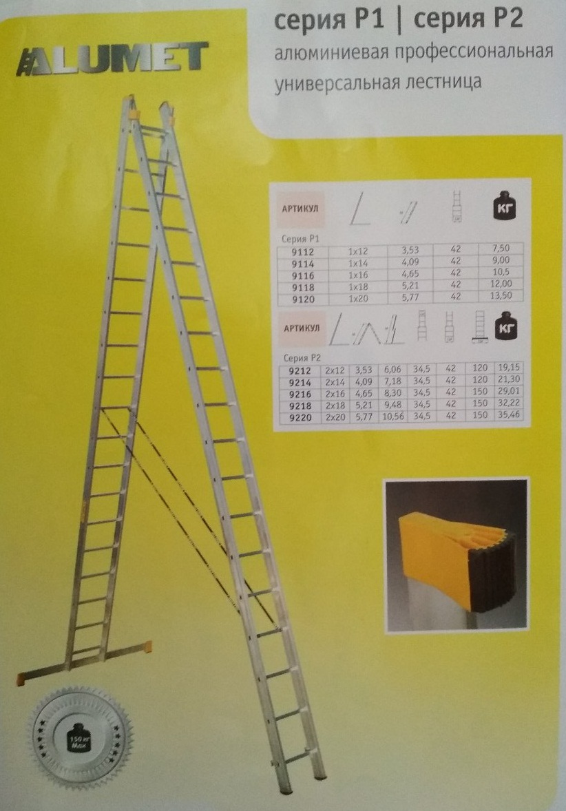 Лестницы двухсекционные (универсальные лестницы) - это лестницы, которые могут выполнять функции лестницы-стремянки и приставной лестницы. Преимущество двухсекционной лестницы относительно односекционной - это меньшие габариты при одинаковой достигаемой высоте, возможность использовать лестницу как стремянку, отсутствие необходимости в вертикальной опоре, регулируемая высота подъема за счет своей телескопической конструкции, наличие стабилизатора увеличенной ширины для более высокой устойчивости.Наличие