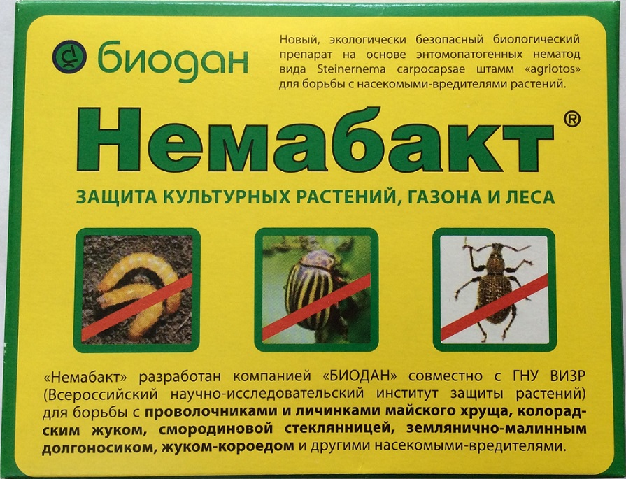 Биоинсектицид «Немабакт» - новый биологический препарат на основе энтомопатогенных нематод для борьбы с насекомыми-вредителями.Препаративная форма – инвазионные личинки нематод в поролоновой крошке. Препарат зарегестрирован на территории РФ, является экологически чистым и абсолютно безопасным продуктом для растений, человека и теплокровных животных, поражает только насекомых, безопасен для полезных членистоногих.