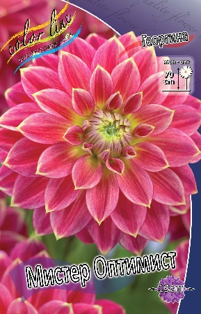 Георгина Мистер Оптимист. Однолетнее клубневое растение группы Декоративных георгин серии Макси. Цветок махровый, палево-красный с ярко-жёлтыми стрелками по краю лепестков, диаметром 10-13 см. Лепестки плоские, широкие, заостренные на концах. Куст мощный, пышный, стебли полые высотой до 70 см. Листья перистые, тёмно-зеленые, многочисленные. Цветет обильно и продолжительно с июля по сентябрь. Предпочитает солнечные, защищенные от ветра места, плодородные хорошо дренированные почвы. Используется для групповых посадок и на срезку. Не требует дополнительных опор. Устойчива к неблагоприятным условиям, к болезням и вредителям. На зиму клубни выкапывают и хранят в погребах, подвалах при температуре 3-6 градусов и относительной влажности 50-60 %. Георгины размножают делением клубней.Наличие