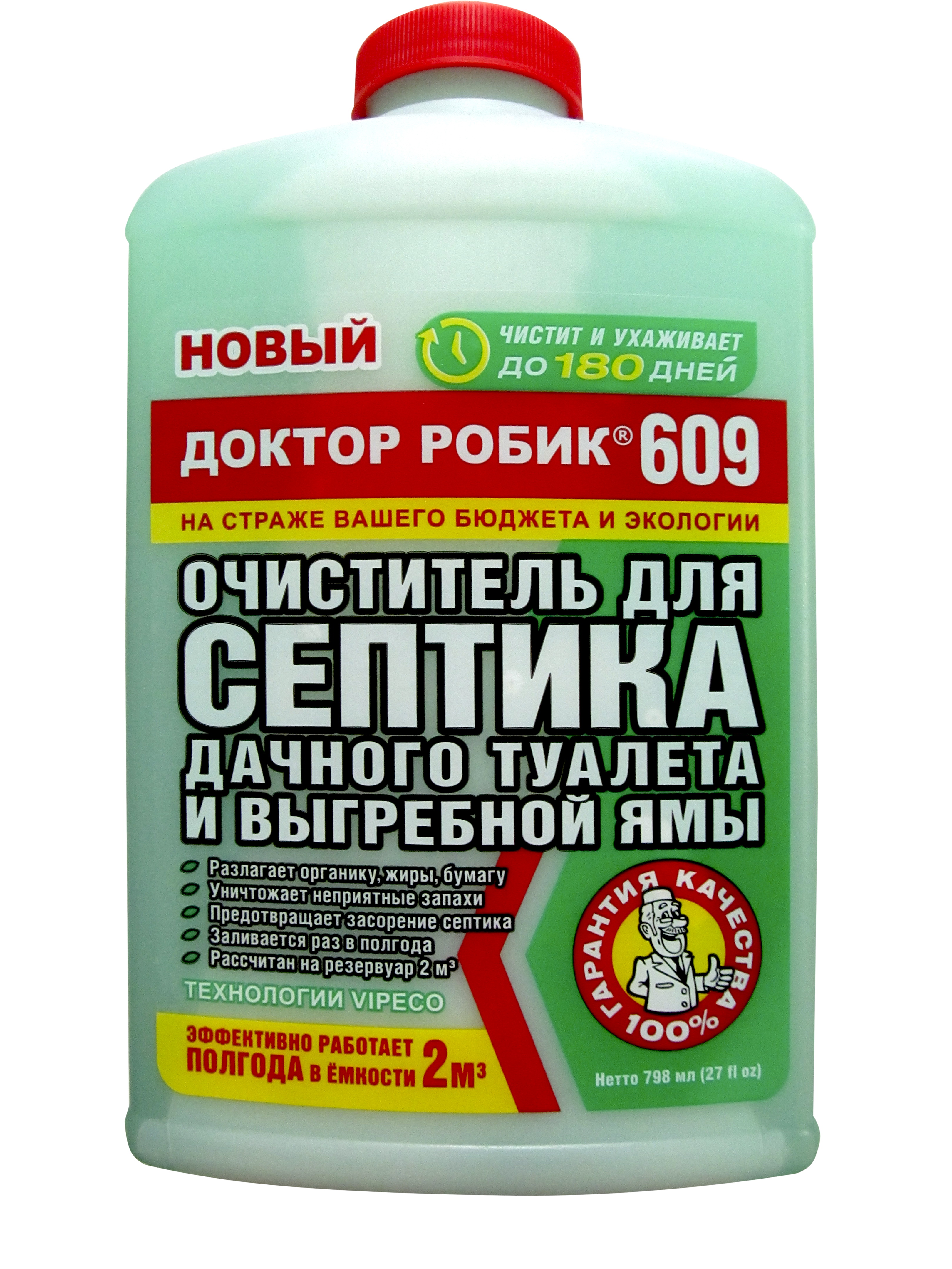 Очиститель для септика, дачного туалета и выгребной ямы Доктор Робик 609 – средство для очистки и ухода за выгребными ямами и септиками, чистит и ухаживает до 180 дней. Разлагает органику, жиры, бумагу. Уничтожает неприятные запахи. Предотвращает засорение септика. Заливается раз в полгода. Рассчитан на резервуар 2 м³.Доктор Робик 609 разработан для разжижения густых масс, окаменелостей, очищает поры в земле и уменьшает слой ила, удаляет неприятные запахи. Разлагает белки, жиры, бумагу, крахмал, мочевину. В течение короткого времени восстанавливает нормальную работу канализационных систем.